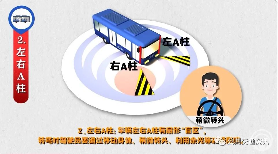 “盲區(qū)”是由于視線受到遮擋,駕駛員無法直接看到的車輛外部的區(qū)域。公交駕駛員運營時要防范各類“盲區(qū)”風(fēng)險。