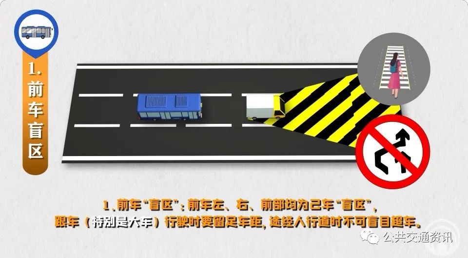 2、旁車“盲區(qū)”:同向車頭、對向車尾都是己車“盲區(qū)”,駕駛員要做到“同向超車當(dāng)心車頭、對向會車當(dāng)心車尾”,防范突然躥出橫穿馬路的行人。