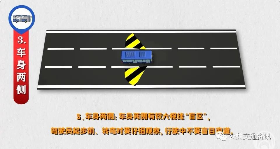 3、車身兩側(cè):車身兩側(cè)有較大視線“盲區(qū)”,駕駛員起步前、轉(zhuǎn)彎時要仔細觀察,行駛中不要盲目變道。