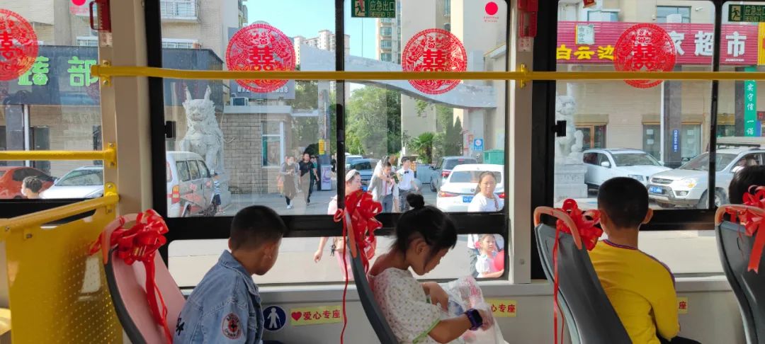 車窗貼著象征愛(ài)情的“囍”字剪紙