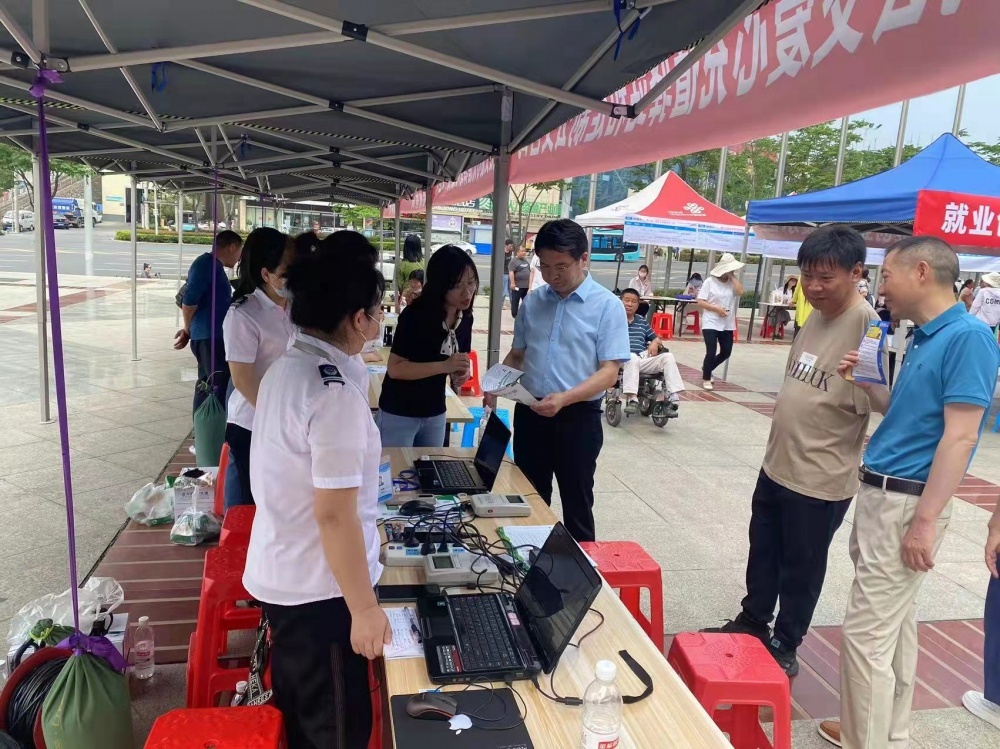圖為工作人員現(xiàn)場(chǎng)發(fā)放服務(wù)指南,為殘疾人士詳細(xì)講解愛(ài)心卡的辦理流程和注意事項(xiàng),并聽取他們的意見和建議。