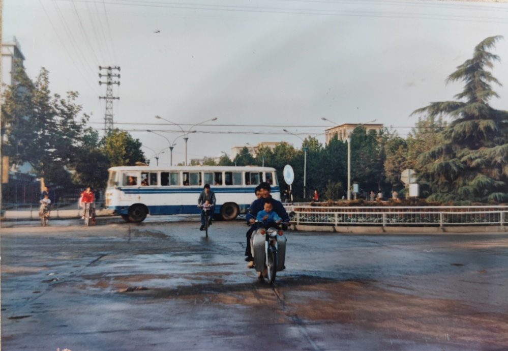 ▲90年代初,荊門市象山大道街景(海慧轉(zhuǎn)盤)。道路上車輛很少,公交車、摩托車、自行車是主流。