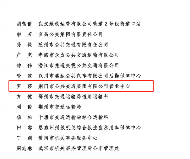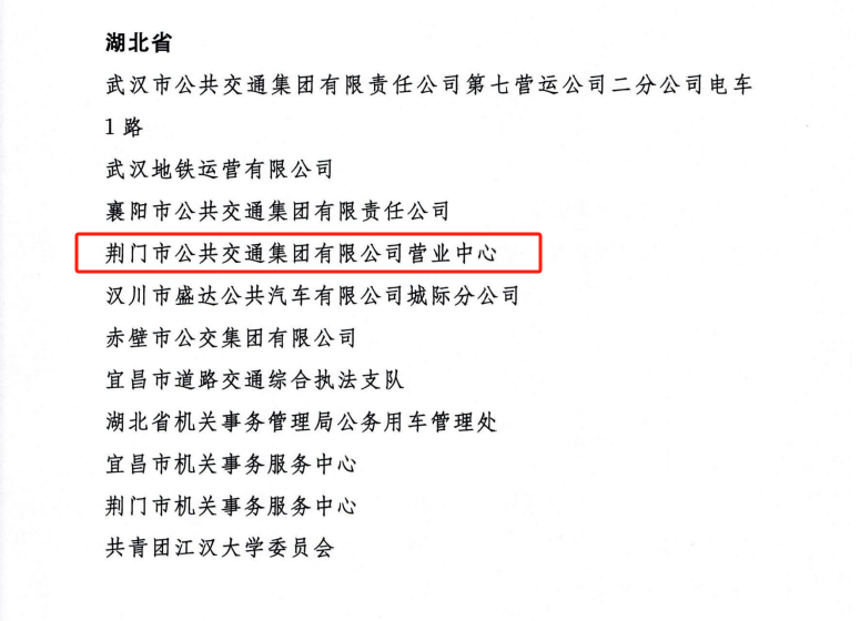 近日,交通運輸部、公安部、國家機關(guān)事務管理局、中華全國總工會、共青團中央聯(lián)合發(fā)出《關(guān)于表揚2023年綠色出行宣傳月和公交出行宣傳周活動成績突出集體和個人的通報》。其中,荊門市公共交通集團有限公司營業(yè)中心被評為活動成績突出集體,荊門市公共交通集團有限公司羅莎被評為活動成績突出個人。
