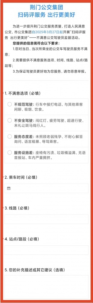 市民乘客可通過(guò)掃描公交車上的“服務(wù)監(jiān)督二維碼”,進(jìn)入“不滿意公交駕駛員監(jiān)督舉報(bào)”頁(yè)面,填寫詳細(xì)舉報(bào)信息(評(píng)價(jià)頁(yè)面如下)。