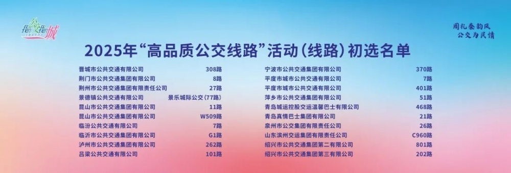 近日交通運(yùn)輸部2025年“我的公交我的城”主題宣傳活動(dòng)(寶雞站)相關(guān)初選名單公布8路巾幗示范線入選2025年“高品質(zhì)公交線路”活動(dòng)初選名單。