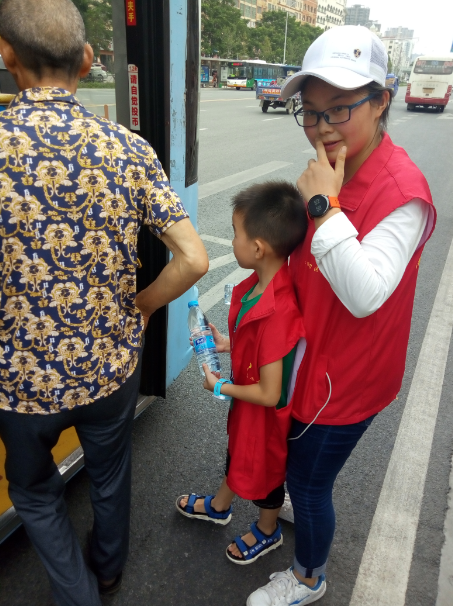 15時許,志愿者們已經(jīng)布置好了送水點,將箱礦泉水擺在了站臺旁邊。每有一輛公交車進站??浚驹刚邆兌紩o駕駛員們遞上兩瓶礦泉水,還有一些放暑假的小朋友們,也熱情的加入到此次活動,充當著志愿主力軍,用他們的行動清涼了公交駕駛員的心,傳播著社會正能量。