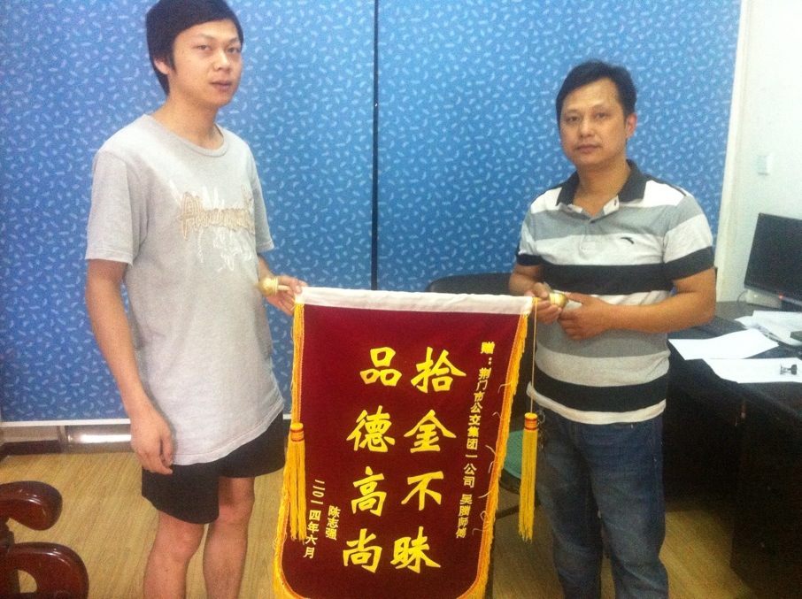 原來,15日下午2時許,1路公交車司機吳騰驅車途經(jīng)城區(qū)長寧大道長寧8號廣場(中百倉儲)公交站點時,在馬路中央撿到一個黑色皮包,并及時上交到公交集團公汽一公司。公司負責人將皮包內(nèi)身份證信息通過《荊門晚報》及荊門社區(qū)網(wǎng)絡媒體發(fā)布尋找失主陳先生信息,陳先生看到招領信息后,很快得知錢包的下落了,他說這(找回錢包)是他萬萬沒想到的。18日上午,陳先生順利地從公汽一公司負責人手中認領到丟失的錢包,并特意為吳師傅制作了一面"拾金不昧 品德高尚"錦旗表示謝意。