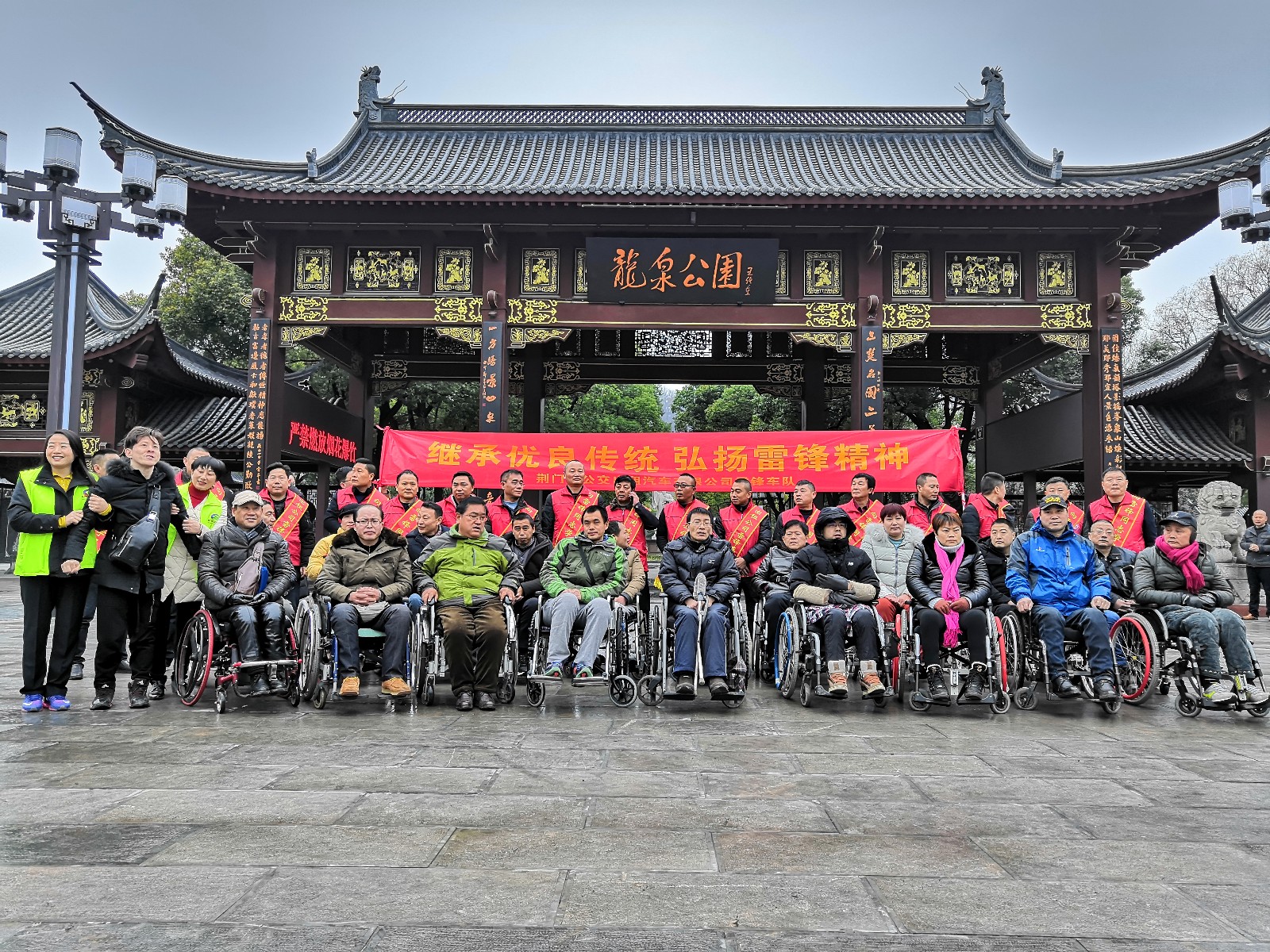10時(shí),車隊(duì)到達(dá)龍泉公園,在新修建的公園門口殘疾朋友集中合影留念,在公交黨支部的帶領(lǐng)下共同宣讀入黨誓詞,唱雷鋒歌。在融洽歡樂(lè)的氛圍下開始了游園之行。