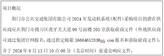 項(xiàng)目名稱:荊門市公共交通集團(tuán)有限公司2024年發(fā)動(dòng)機(jī)系統(tǒng)(配件)采購項(xiàng)目